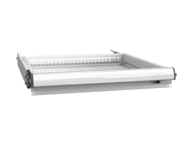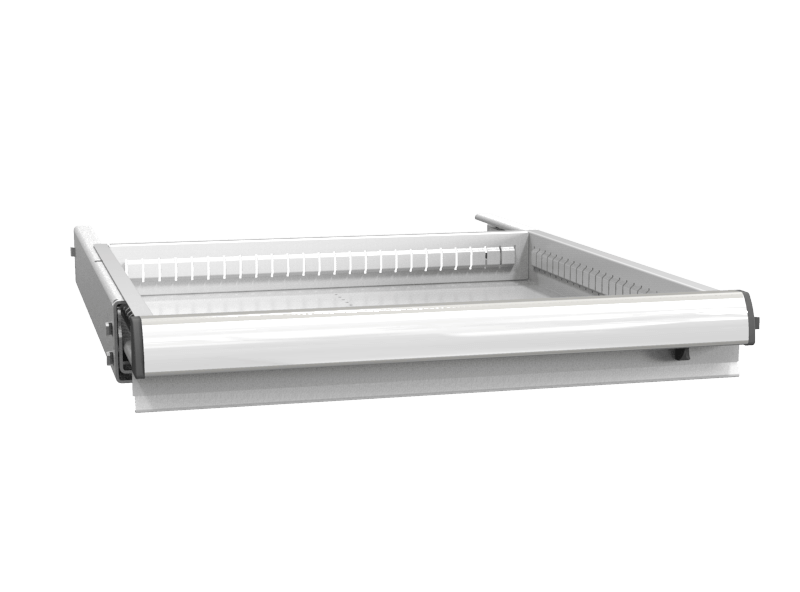 Zásuvka s poistkou bráni samovoľnému otvoreniu zásuvky. Štandardne je vo výbave mobilných výrobkov. Konštrukcia výsuvu zaistí 100% vysunutie zásuvky a umožní tak prístup k celej jej ploche. Vodiace lišty výsuvného mechanizmu sú v bočniciach korpusov skríň nastaviteľné po 25 mm. Plynulý, tichý chod, maximálne zaťaženie 200 kg.